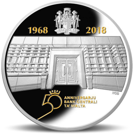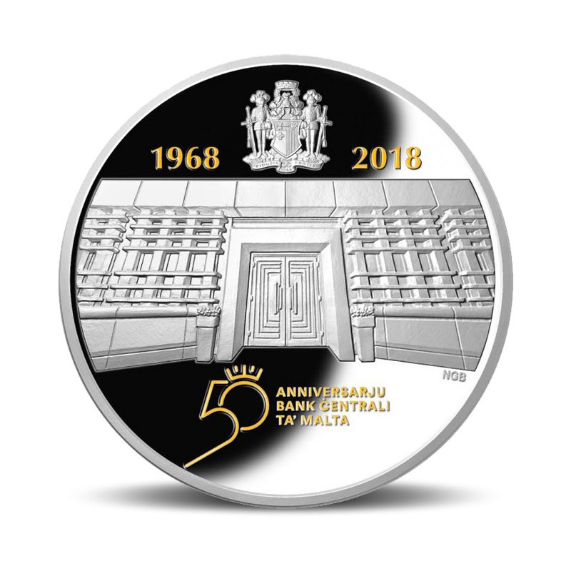 Le 17 avril 2018, la Banque centrale de Malte célèbre son cinquantième anniversaire. Pour marquer cette étape importante, la Banque a émis une pièce numismatique en argent, d'une valeur faciale de 10 euros. Le revers des pièces porte une représentation de la façade des nouveaux locaux de la Banque centrale de Malte, "Binja Laparelli", situés dans le quartier St James Counterguard à La Valette, ainsi qu'un logo du 50e anniversaire conçu par Michael Grech et Daniel Galea de l'Institut des arts et du design MCAST. Les pièces d'argent ont fait l'objet d'une dorure sélective, technique utilisée pour la première fois sur des pièces numismatiques maltaises. L'avers des pièces présente les armoiries de Malte ainsi que la dénomination de la pièce.
