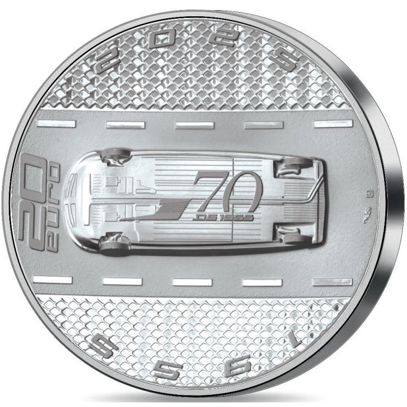 Il y a 70 ans, en 1955, le monde de l'automobile a connu une révolution avec l'arrivée de la DS. La DS 19 a été la première DS et a été produite à partir de 1955. Ce modèle se distingue par ses phares avant sous une vitre profilée et sa calandre plus moderne. Cette pièce met en valeur la DS dans son intégralité grâce au Haut-relief, une prouesse technique qui implique un relief plus important que les pièces traditionnelles. Sur l'avers, les lignes fluides et aérodynamiques de la DS 19 sont visibles en vue aérienne. Le revers reproduit le sous-châssis de cette DS. La pièce est conçue comme un modèle réduit de la DS 19 afin de mettre en valeur son architecture distinctive.