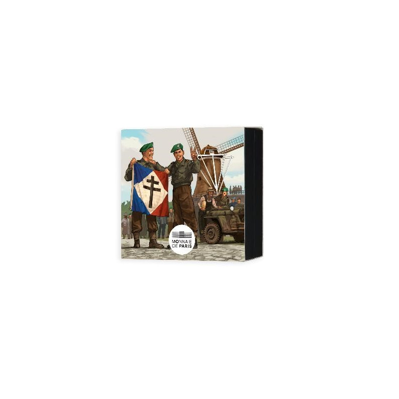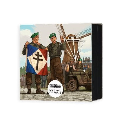 Eleven months after landing on the beaches of Normandy, Allied forces scattered across Europe celebrate the surrender of Nazi Germany. A historic day, “V-E DAY” (or Victory in Europe Day) symbolizes the end of nearly six years of conflict and the return of peace for millions of Europeans. 80 years after this decisive victory, Monnaie de Paris celebrates this historic event by paying a new tribute to the great Allied nations who fought for the liberation of France and Europe. Léon, Second-Maître (Petty Officer) of the Kieffer. Commando, was one of the 177 Frenchmen who took part in the Normandy landings. After D-Day, he took part in the Battle of Normandy until August 27th , 1944, when N°4 Commando was put to rest in Great Britain. In November, he returned to the front in the Netherlands with his comrades. He took part in the Walcheren landing and the capture of Vl. The reverse of this coin features all the Allied countries that officially took part in the Normandy landings, surrounded by the face value and the RF initials. Clockwise: France Libre, Netherlands, New Zealand, Poland, Australia, USA, Norway, UK, Czechoslovakia, Canada, Belgium
