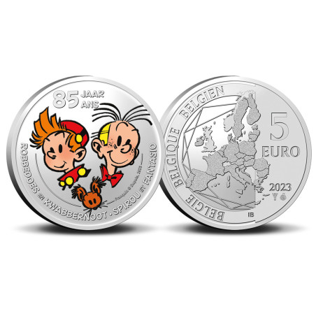 En étroite collaboration avec l'éditeur, la Monnaie royale de Belgique a créé une pièce de 5 euros commémorative pleine d'énergie. Une véritable fête pour le duo de reporters jubilaire ! L'édition de Spirou et Fantasio est un objet de collection pour les numismates et les amateurs de bandes dessinées. La pièce belge de 5 euros "85 ans de Spirou et Fantasio", qui représente les portraits des reporters du jubilé, accompagnés de leur écureuil Spip, est disponible en deux versions : en relief et en couleur. Toutes deux sont frappées en qualité BU et ont une édition limitée à 7 500 exemplaires.