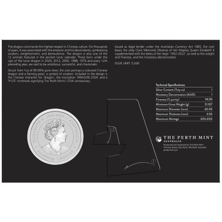 Le dragon inspire le plus grand respect dans la culture chinoise. Pendant des milliers d'années, il a été associé à l'empereur et à ses descendants, symbolisant la sagesse, l'illumination et la bienveillance. Le dragon est également l'un des douze animaux figurant dans l'ancien calendrier lunaire. Les personnes nées sous le signe du dragon lunaire en 2024, 2012, 2000, 1988, 1976 et toutes les 12 années précédentes sont réputées ambitieuses, prospères et charismatiques. Frappée par la Perth Mint à partir d'une once d'argent pur à 99,99 %, chaque pièce a cours légal en vertu de la loi australienne sur la monnaie de 1965. La Perth Mint ne mettra pas en circulation plus de 5 000 pièces de la Sydney Money Expo ANDA Special Australian Lunar Series III 2024 Year of the Dragon 1oz Silver Lilac Coloured Coin en carte dans un emballage individuel sur un tirage maximum de 200 000.