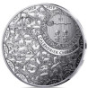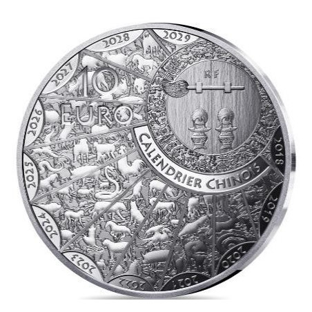 Au centre de l'avers de la pièce, un serpent ondule autour d'un anneau gravé de motifs traditionnels chinois. Le reptile est en mouvement, partiellement enroulé autour de l'anneau et comme prêt à s'échapper des bords de la pièce, qui sont ornés d'orchidées, la fleur associée à ce signe. Le sentiment de calme qui émane de la représentation du serpent renvoie directement à ce qui est l'une des principales caractéristiques des natifs de ce signe. L'idéogramme " Serpent " apparaît sur l'une des courbes de son corps. L'année 2025 et l'inscription signifiant " Année du serpent " apparaissent sur le contour du dessin. Le revers présente tous les animaux du zodiaque chinois. Ils sont tous représentés sur un écran entourant la porte d'un temple chinois traditionnel. Un cycle complet du zodiaque chinois sera composé de 2018 à 2029. Chacune de ces douze années présente donc un animal de ce calendrier. La valeur faciale est visible en haut à gauche et la mention "RF" figure sur la porte.