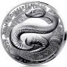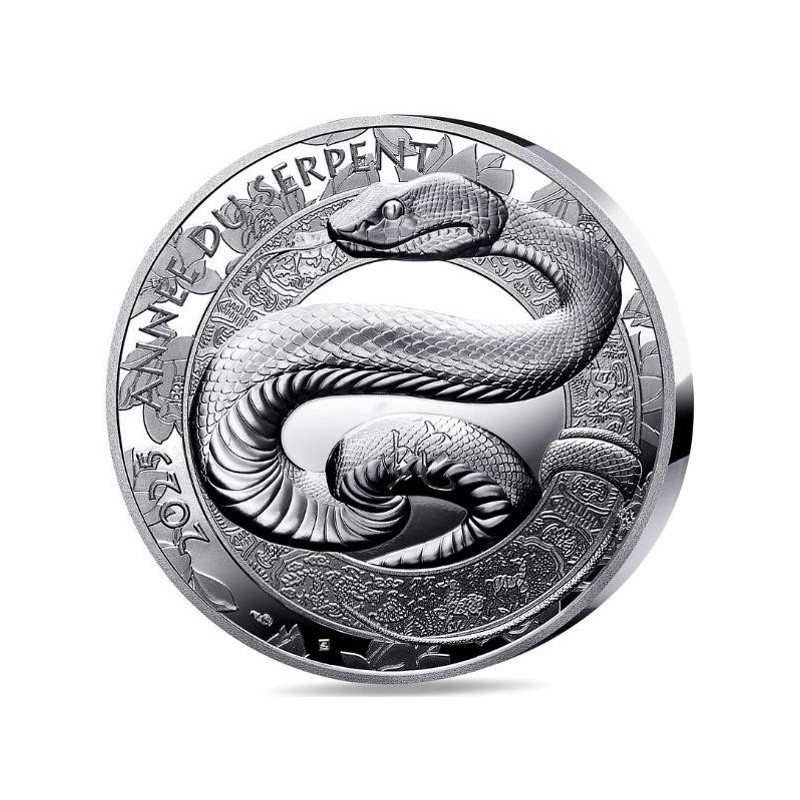 Au centre de l'avers de la pièce, un serpent ondule autour d'un anneau gravé de motifs traditionnels chinois. Le reptile est en mouvement, partiellement enroulé autour de l'anneau et comme prêt à s'échapper des bords de la pièce, qui sont ornés d'orchidées, la fleur associée à ce signe. Le sentiment de calme qui émane de la représentation du serpent renvoie directement à ce qui est l'une des principales caractéristiques des natifs de ce signe. L'idéogramme " Serpent " apparaît sur l'une des courbes de son corps. L'année 2025 et l'inscription signifiant " Année du serpent " apparaissent sur le contour du dessin. Le revers présente tous les animaux du zodiaque chinois. Ils sont tous représentés sur un écran entourant la porte d'un temple chinois traditionnel. Un cycle complet du zodiaque chinois sera composé de 2018 à 2029. Chacune de ces douze années présente donc un animal de ce calendrier. La valeur faciale est visible en haut à gauche et la mention "RF" figure sur la porte.