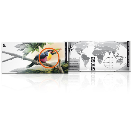 Cette série Flat Bar met en valeur la zone climatique tropicale. Les émissions de la série Flat Bar sont frappées avec 5 grammes d'argent pur (.999). Chaque Flat Bar mesure 15 cm sur 7 cm. Chaque avers représente, dans de belles couleurs, un animal ou une plante en particulier. En haut à gauche, le poids "5g" est indiqué et à droite, la zone climatique correspondante est mentionnée.