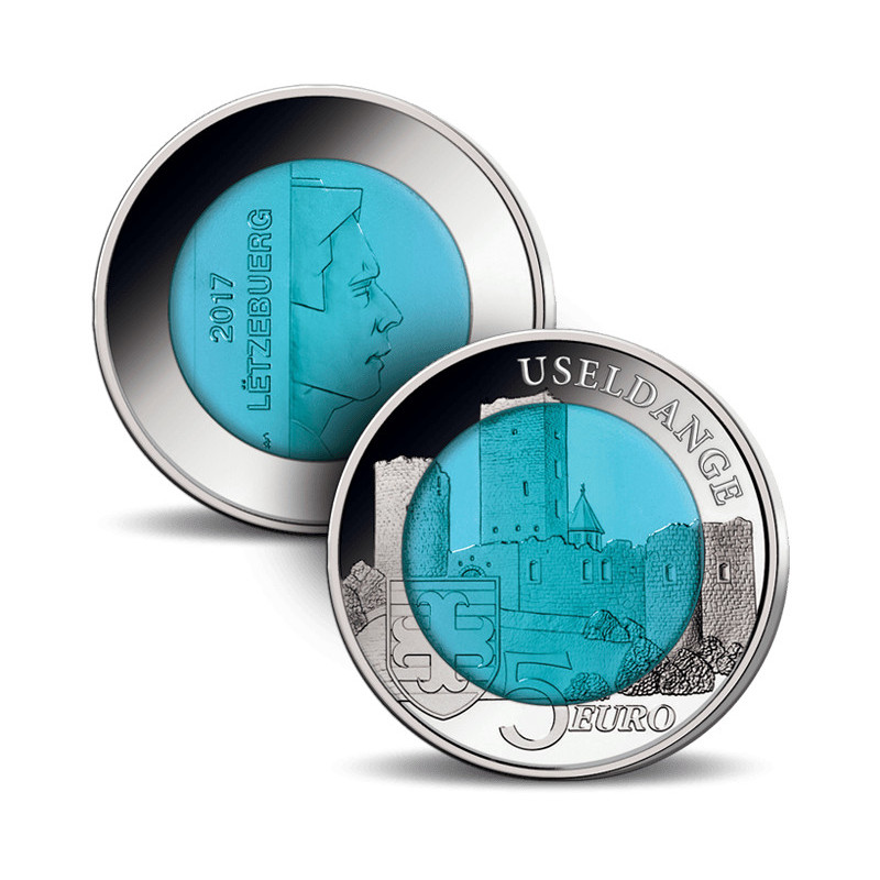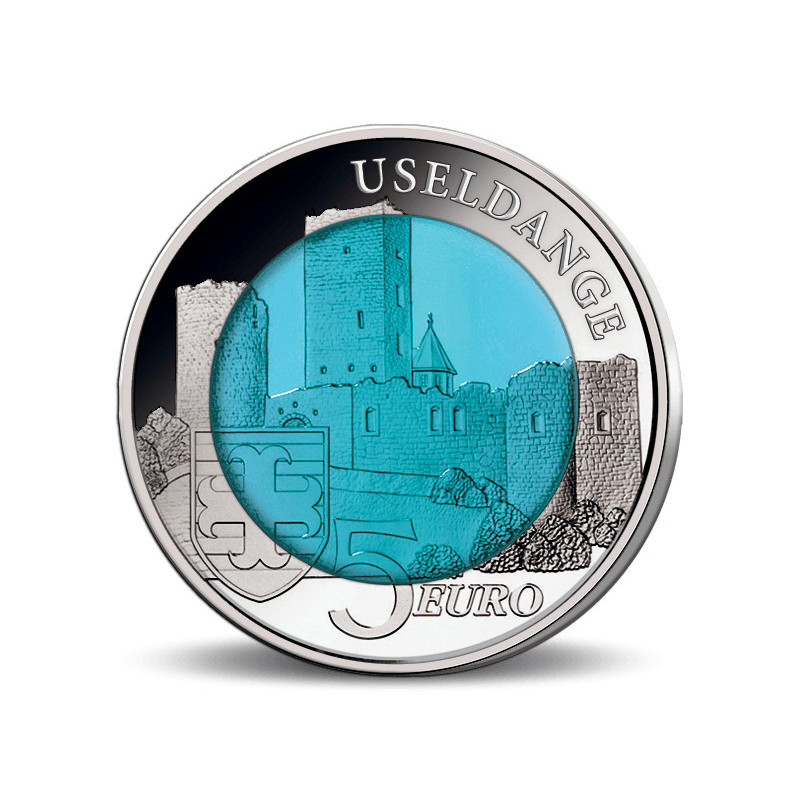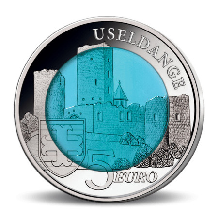 La pièce représente l'un des célèbres châteaux du Luxembourg : Château d'Useldange. Cette ruine séculaire se trouve au milieu de la ville du même nom et est classée comme site patrimonial protégé depuis des décennies. Ainsi, les vestiges du château sont particulièrement bien conservés et une multitude d'informations historiques sont fournies. Le cœur de cette monnaie luxembourgeoise spéciale est constitué de niobium pur (99,9%). Lorsque le niobium est traité d'une certaine manière, il acquiert un éclat bleu typique.