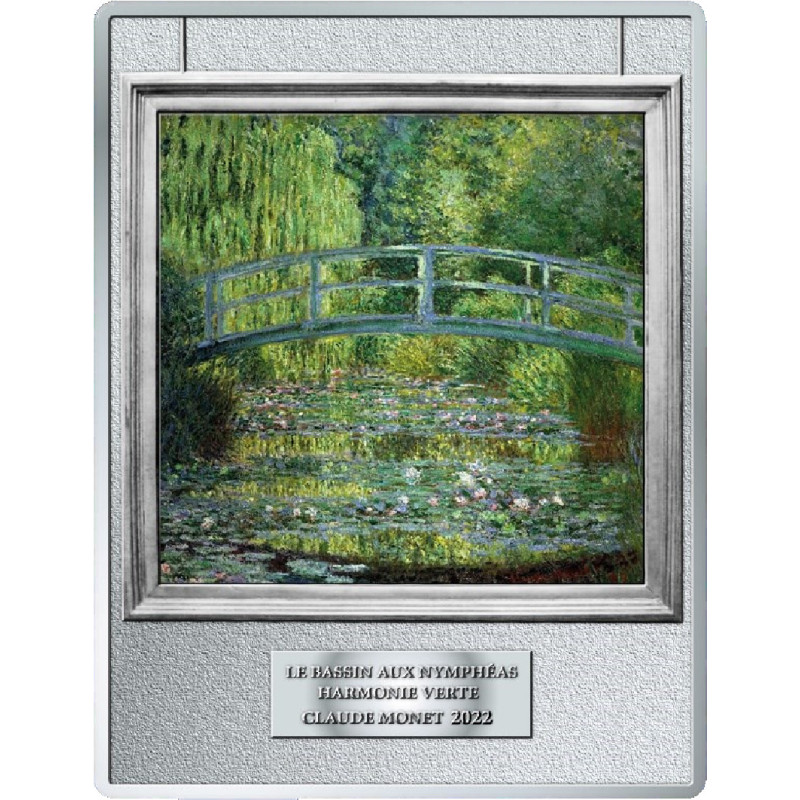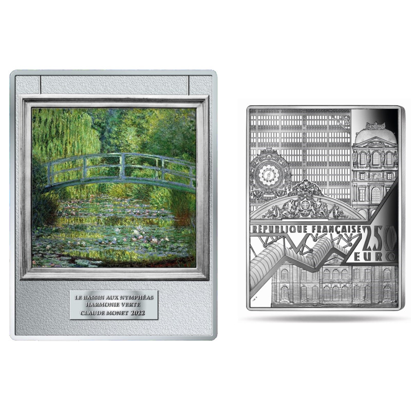 Cette pièce commémorative française unique de 250 euros est un superbe hommage à l'un des plus célèbres chefs-d'œuvre du peintre français Claude Monet : L'étang aux nénuphars avec le pont japonais. Cette pièce de grande valeur est composée de 0,5 kilogrammes d'argent et frappée dans la qualité de frappe la plus élevée : Proof.