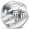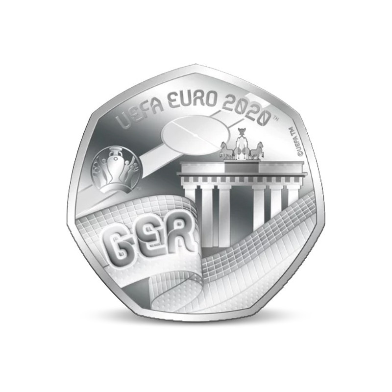 Cette pièce présente un drapeau allemand agité et l'abréviation GER. On voit également la porte de Brandebourg et le logo du championnat d'Europe 2020.