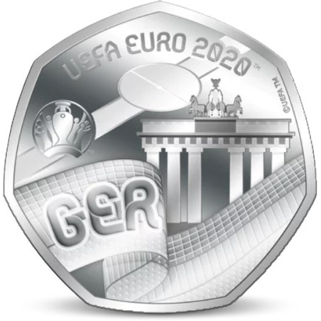 Cette pièce présente un drapeau allemand agité et l'abréviation GER. On voit également la porte de Brandebourg et le logo du championnat d'Europe 2020.