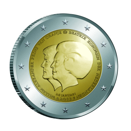 Dans une déclaration diffusée sur les médias nationaux le 28 janvier 2013, la reine Beatrix a annoncé son intention d'abdiquer le 30 avril (fête de la Reine), date à laquelle elle sera restée sur le trône pendant exactement 33 ans. La reine Beatrix a déclaré qu'il était temps de "confier la responsabilité du pays à la nouvelle génération". L'héritier du trône est son fils aîné, le prince Willem-Alexander. La Reine sera le troisième monarque néerlandais à abdiquer le trône, après sa grand-mère et sa mère. La pièce de 2 euros à double portrait est destinée à commémorer cette occasion spéciale.