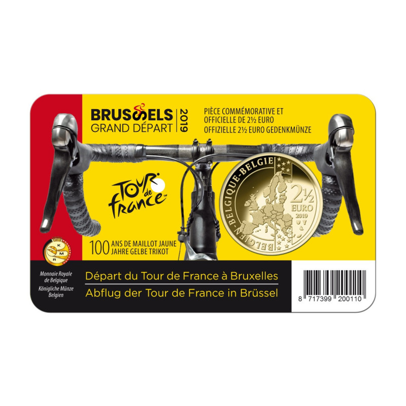 Cette pièce commémorative de 2,5 euros de 2019 commémore à la fois le 100e anniversaire du maillot jaune et le départ du Tour de France de Bruxelles. La Monnaie Royale de Belgique a émis la pièce en qualité brillant non circulé et est présentée dans une carte numismatique disponible en deux versions linguistiques : néerlandais/anglais et français/allemand. Il s'agit de la version française/allemande.