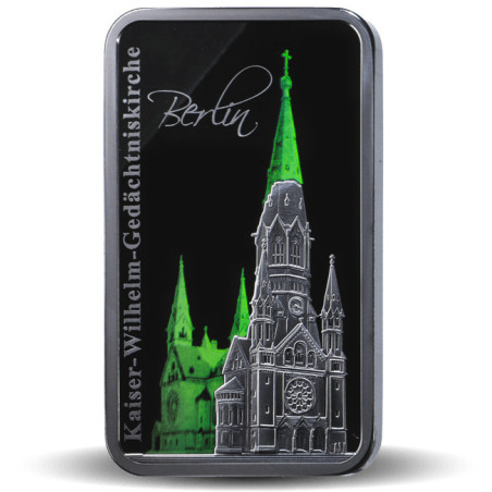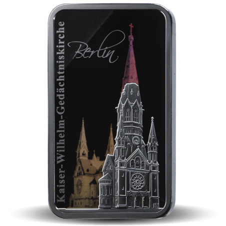Cette magnifique pièce de 1 once en argent présente au revers l'église commémorative du Kaiser Wilhelm, dont une partie a été recréée à l'aide d'une technique d'hologramme.