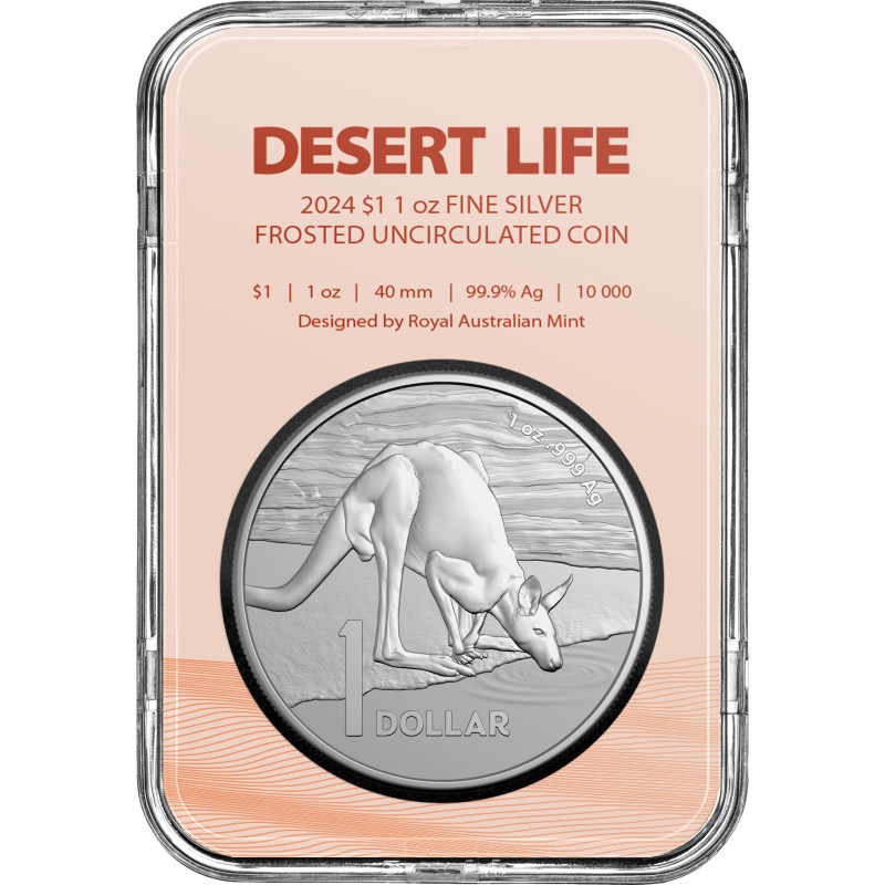 La Royal Australian Mint est fière de présenter Desert Life, la trente et unième pièce de sa série Kangaroo, célébrant l'emblématique kangourou rouge et son habitat dans le centre aride de l'Australie. Le motif du revers représente un kangourou en train de se rafraîchir à un point d'eau dans le désert. Les finitions polies et givrées uniques de cette pièce de 1 dollar en argent givré non circulée 2024 créent un contraste saisissant avec les autres pièces belle-épreuves de cette série 2024. La vie dans le désert est rude et impitoyable, mais le kangourou rouge s'est adapté à cet environnement et peut rester longtemps sans eau. Mais lorsqu'il trouve de l'eau, cet habitant du désert prend plaisir à se rafraîchir longuement. Cette superbe pièce à tirage limité est aussi précieuse et rare qu'un verre d'eau dans le désert.