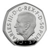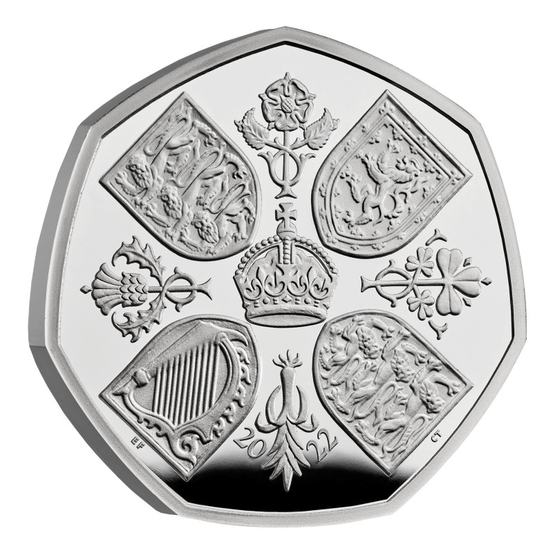Le revers de la pièce présente une version modifiée du dessin de la couronne du couronnement de 1953, avec la date d'émission 2022 incorporée. Autour de la couronne centrale, avec une rose, un chardon, un trèfle et un poireau dans les angles, se trouvent les écus des armes royales. En dessous, on peut voir la date " 20 22 " avec un poireau entre les deux. Sur l'avers de la pièce figure le premier portrait officiel du nouveau roi, dessiné par Martin Jennings et personnellement approuvé par le monarque. Le roi regarde vers la droite, dans la direction opposée à celle de la défunte reine Elizabeth II.