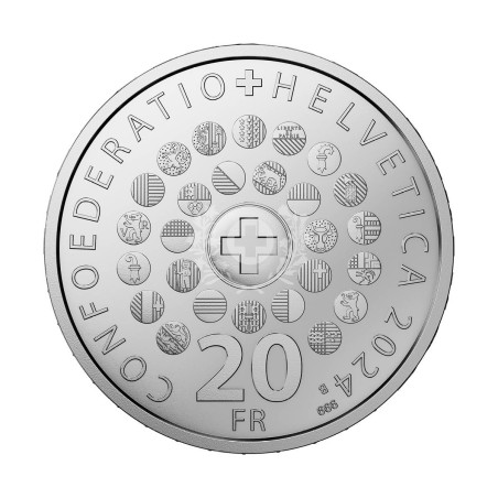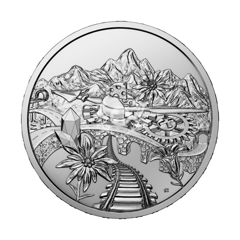 La nouvelle pièce d'argent "Switzerland" offre une représentation fascinante de notre pays sous toutes ses facettes. Le souci du détail caractérise le dessin, qui contient de nombreux symboles représentant la diversité et l'unité de la Suisse. Le 12 septembre 1848, la Suisse moderne est née avec la Constitution fédérale, un État fédéral issu de la fusion des cantons. Cette date est honorée par l'émission de la pièce, qui rend hommage à notre structure fédérale. Cette structure est essentielle à la force d'innovation, au dialogue et à la cohésion nationale de la Suisse. Cette pièce spéciale symbolise la Suisse avec tous ses cantons. La face de la pièce montre des montagnes qui rappellent les Alpes suisses, un chemin de fer, qui fait référence au réseau ferroviaire dense, l'edelweiss, une fleur alpine typique, et un cristal de quartz, qui reflète la richesse minérale des Alpes, ainsi qu'un pont, qui symbolise l'infrastructure technique. Les roues dentées font référence à l'horlogerie et un fromage symbolise la célèbre tradition fromagère suisse. La face valeur de la pièce représente les armoiries des 26 cantons.