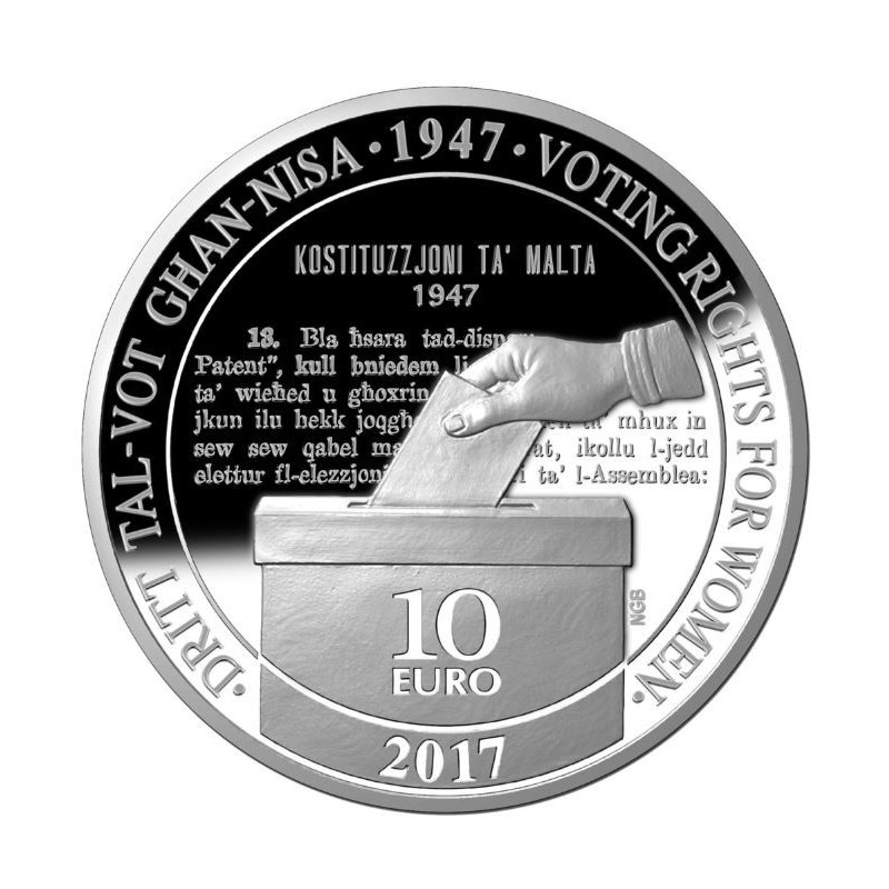 La Banque centrale de Malte a émis une pièce de 10 euros en argent en 2017 pour marquer le 70e anniversaire de cette réalisation importante. Conçue et gravée par l'artiste Noel Galea Bason. On voit un vote en cours et en arrière-plan une partie du texte constitutionnel. Autour de cette image est inscrit en maltais et en anglais ce droit de vote : "DRITT TAL-VOT GHAN-NISA 1947 DROIT DE VOTE POUR LES FEMMES".