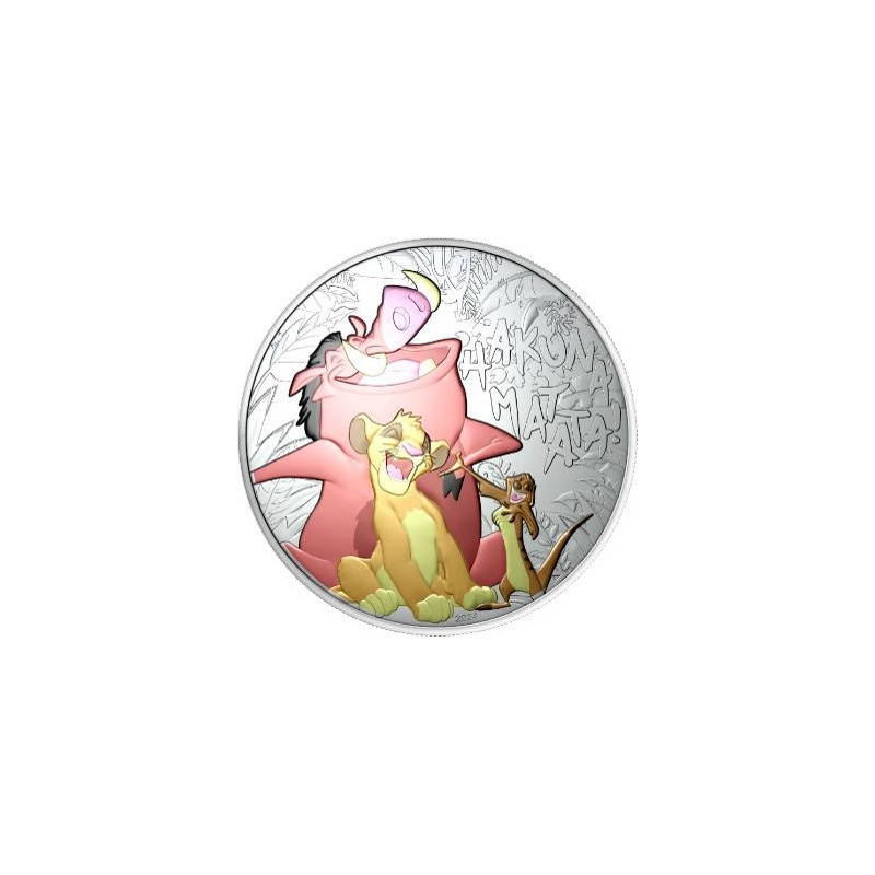 Le Roi Lion de Disney est un véritable voyage initiatique. Il raconte l'histoire de Simba, un jeune lionceau destiné à devenir roi, qui doit surmonter la perte tragique de son père, apprendre à se pardonner ses erreurs et accepter ses responsabilités afin de rétablir l'harmonie dans son royaume. 30 ans après la sortie en salles de l'un des plus grands chefs-d'œuvre de Disney, la Monnaie de Paris rend un vibrant hommage aux personnages du Roi Lion. aux personnages du Roi Lion avec une collection de pièces nostalgiques. Cette pièce de collection en argent colorisé représente Timon, Pubmaa et Simba chantant Hakuna Matata. Le revers de cette pièce comporte une représentation de Mufasa, s'élevant majestueusement au-dessus du rocher du Lion. Le revers indique également la valeur faciale de la pièce. Le revers indique également la valeur faciale de la pièce et les initiales de la République française.