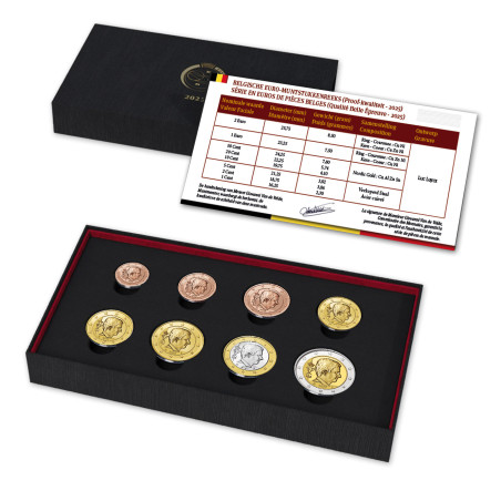 Depuis 2002, la Monnaie royale de Belgique émet chaque année le "Proof Set Belgium", qui contient toutes les pièces en euros en qualité "Proof". Les huit pièces en euros sont présentées de manière sûre et élégante dans un luxueux coffret de collection, accompagnées d'un certificat d'authenticité. Chaque pièce est également emballée dans une capsule protectrice transparente. Cette série annuelle prestigieuse est un must pour tous les collectionneurs de pièces sérieux !