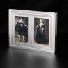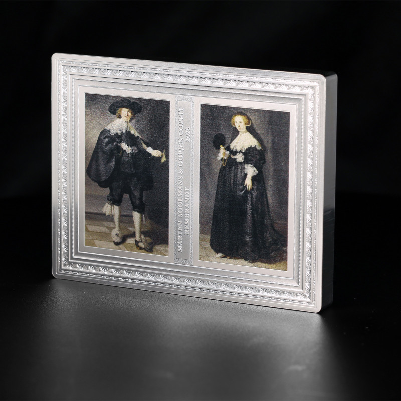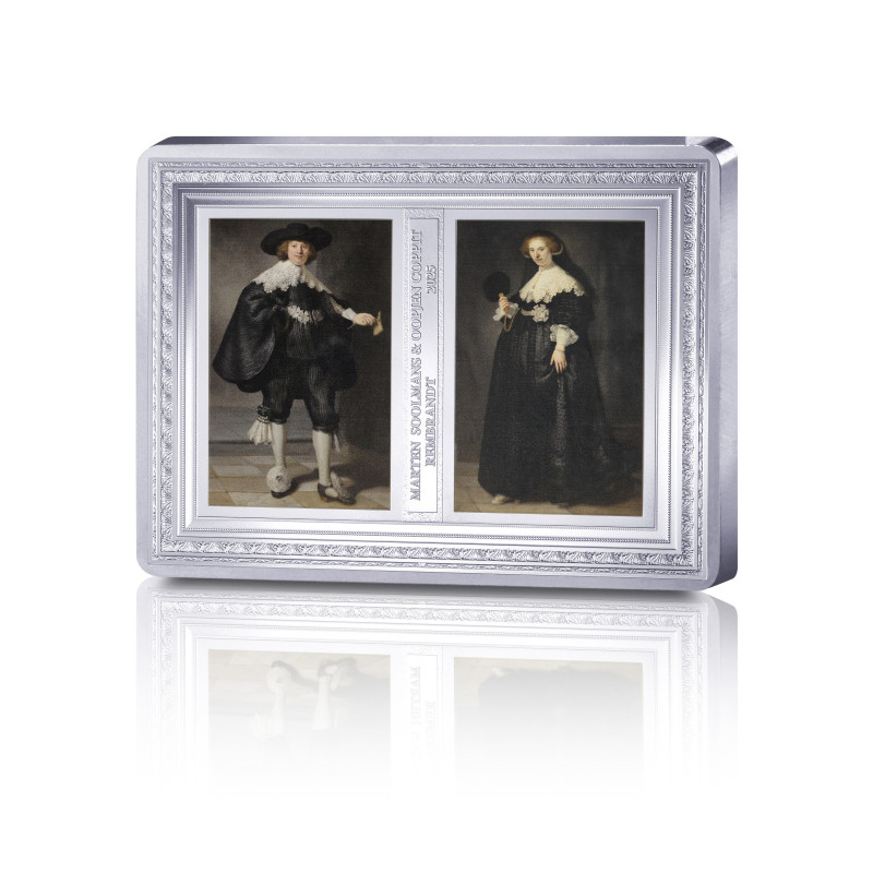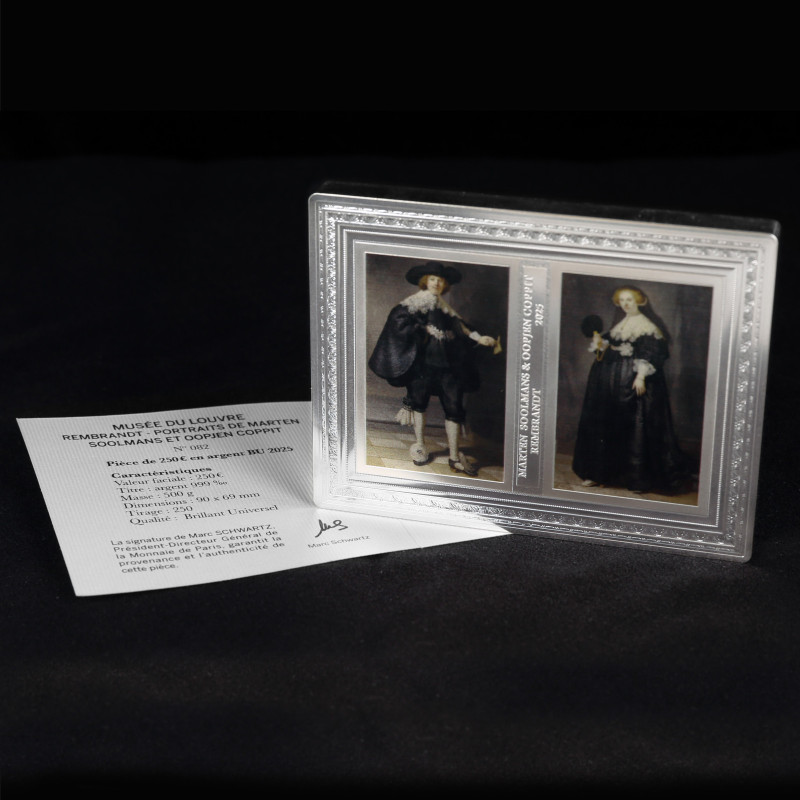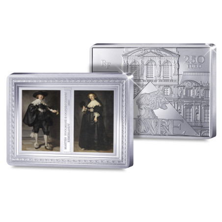 Peints en 1634, ces deux portraits grandeur nature font partie des grandes œuvres d'art de Rembrandt, l'un des maîtres de la peinture hollandaise. Sur l'avers de cette pièce de 250€ en argent 1/2kg BE, les portraits de Marten Soolmans et Oopjen Coppit sont colorisés et représentés dans leur intégralité. Ils sont très légèrement agrandis par rapport à leur version originale afin de mieux représenter les détails. Les noms des sujets, du peintre et du millésime séparent les deux tableaux. Le contour de la pièce est décoré du cadre original des portraits. Le revers, commun à la collection, représente le bâtiment du Louvre vu de la cour intérieure. Au premier plan se trouve la célèbre pyramide du Louvre, à travers laquelle on peut voir une œuvre d'art emblématique : la Victoire ailée de Samothrace. Le nom du musée est inscrit au bas de la pyramide, ainsi que les poinçons aux extrémités. Le sigle "RF" et la valeur faciale apparaissent au-dessus des toits du Palais du Louvre.