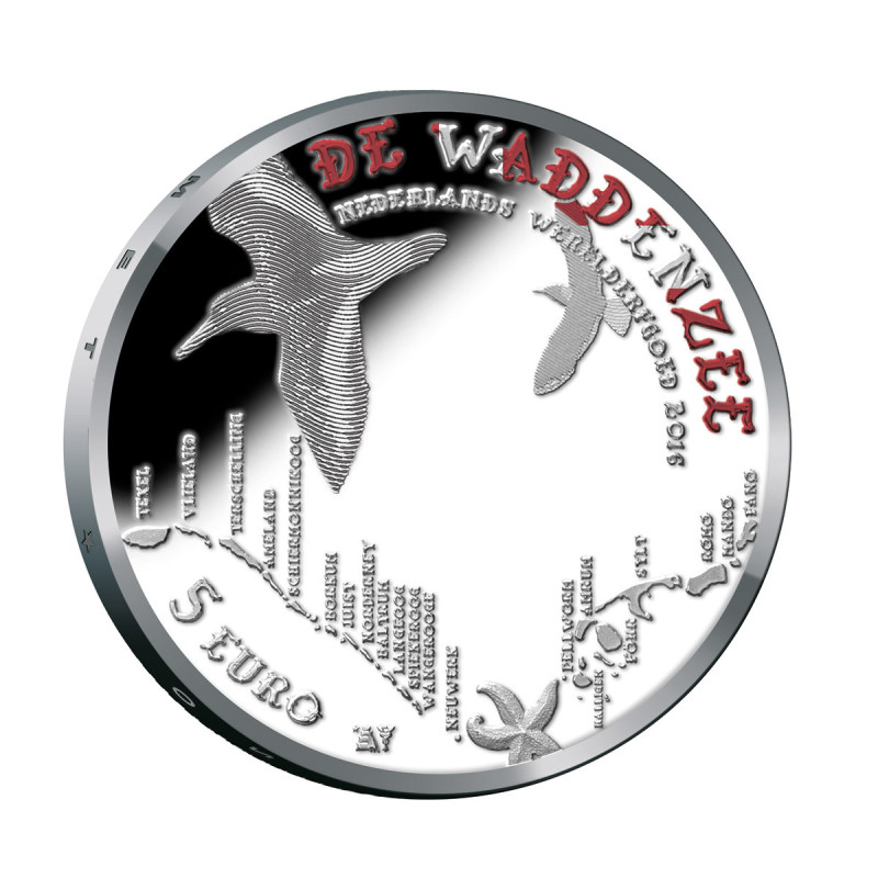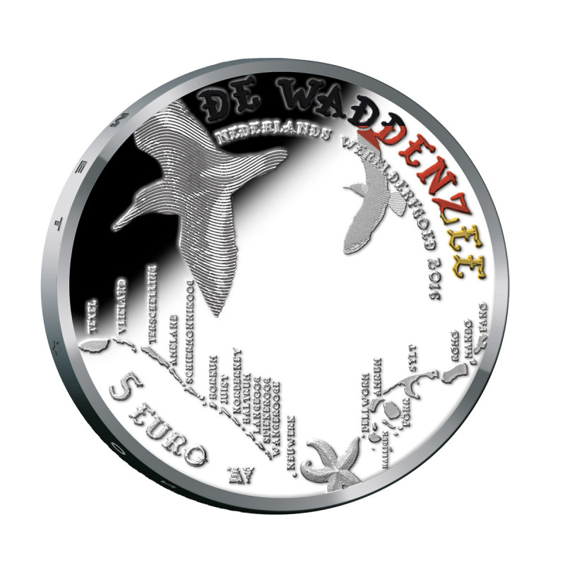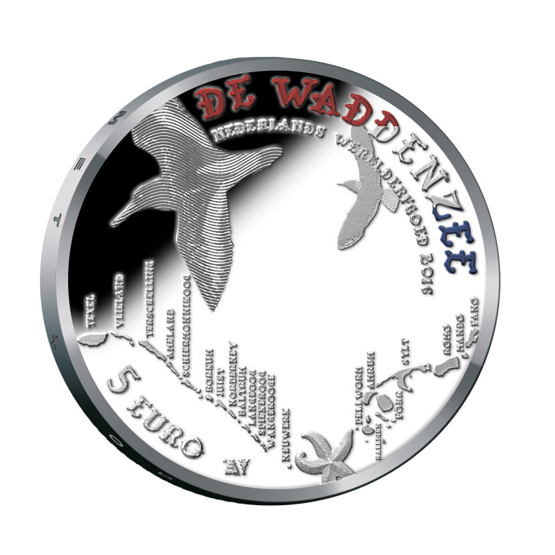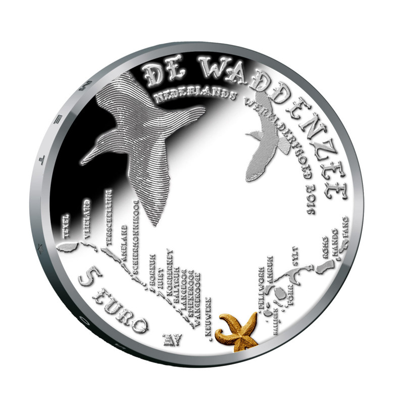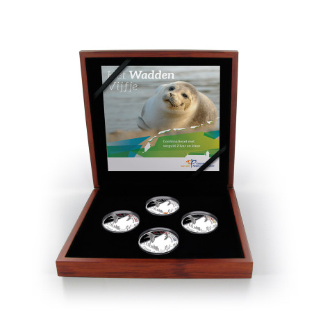 Cet ensemble contient quatre pièces Proof en argent. De cet ensemble, une pièce est partiellement dorée et les trois autres pièces sont colorées. L'étoile de mer est dorée, sur les autres pièces, les couleurs des drapeaux des pays voisins de la mer des Wadden ont été appliquées au texte.