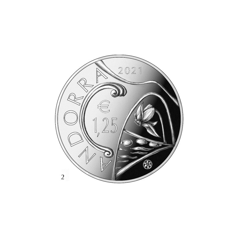 Chacune de ces superbes pièces représente un symbole de l'Andorre : une pièce montre le pont de la Margineda avec le nom " PONT DE LA MARGINEDA " au-dessus, l'autre pièce montre des jonquilles blanches et le texte " GRANDALLA ". Il s'agit du nom catalan de la jonquille. Sur les deux pièces, le revers montre Andorre, 2021 et 1,25 € dans le contour du pont, avec une petite jonquille blanche en dessous.