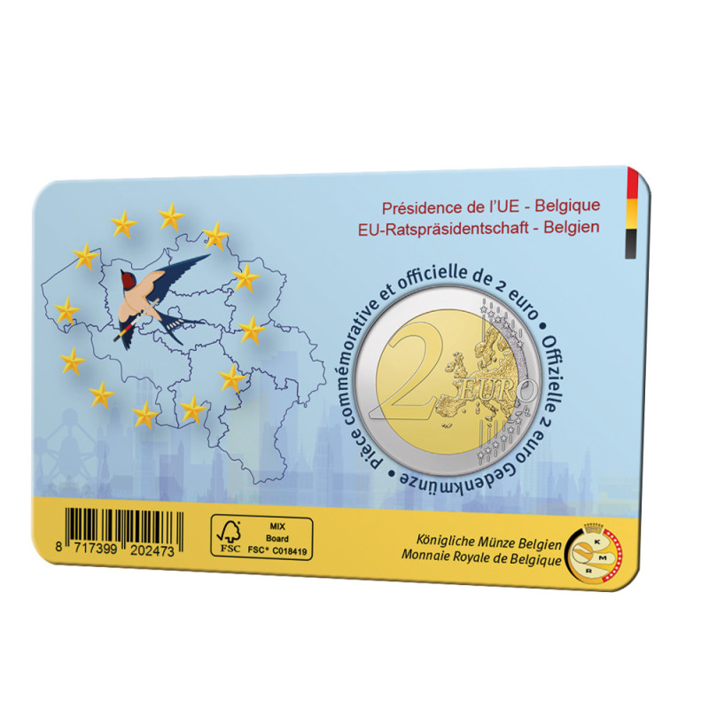 La Belgique assurera la présidence du Conseil de l'UE pendant le premier semestre 2024. Pour célébrer cet événement, la Monnaie royale de Belgique émet une pièce de 2 euros originale qui reflète la forme naturelle du leadership. Sur la pièce, en bas à gauche, figure le texte PRÉSIDENCE BELGE DU CONSEIL DE L'UE 2024. Au centre de la pièce, 27 hirondelles (27 États membres) tournent autour de l'indication BE. Les hirondelles se déplacent ensemble et volent en groupe derrière le chef de file. Les hirondelles sont serviables, industrieuses et loyales. Cette première pièce de 2 euros de 2024 est proposée en brillant non circulé (BU) et en qualité belle-épreuve.