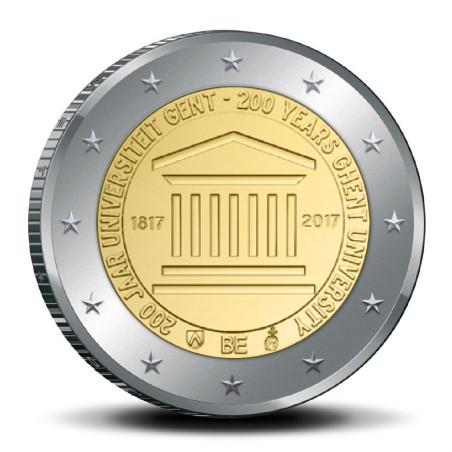L'avers porte le logo de l'université de Gand, avec les dates 1817 - 2017 en dessous, entourées de l'inscription 200 JAAR UNIVERSITEIT GENT (200 ANS UNIVERSITÉ DE GAND) et de l'indication du pays BE. La marque d'atelier de la Monnaie Royale, une tête casquée de l'archange Michel, et la marque d'atelier des directeurs de la Monnaie Royale, les armoiries de la commune de Herzele, sont situées respectivement à droite et à gauche de l'indication de pays.