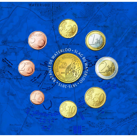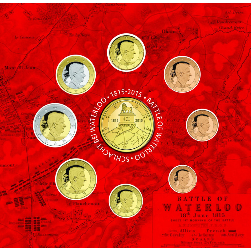 Cette série 2015 de la Belgique a pour thème la bataille de Waterloo. La série comprend les 8 pièces d'euro différentes représentant le roi Philippe, mais aussi la pièce spéciale de 2,5 euros "200 ans de la bataille de Waterloo". L'ensemble est présenté dans un magnifique emballage illustré.