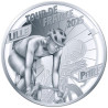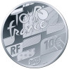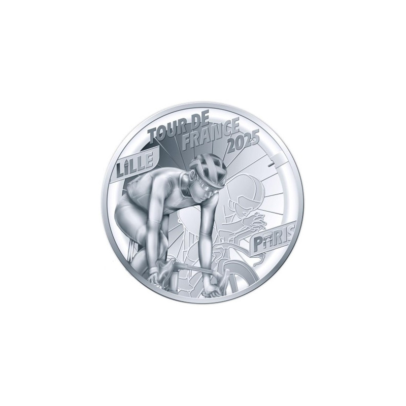 Cette pièce met en évidence les lieux de départ et d'arrivée du Tour de France 2025. Le Tour partira de Lille et s'achèvera sur les Champs-Élysées à Paris. Un cycliste est représenté au premier Un cycliste est représenté au premier plan, avec son ombre dessinée, allant du repère LILLE au repère PARIS. Le "i" de Lille fait référence au Beffroi et le "a" de Paris à l'Arc de Triomphe. Le contour de la pièce et les rayons rappellent une roue de bicyclette. Sur ce revers commun, les quatre maillots du Tour sont représentés de manière héraldique dans des marqueurs : le maillot jaune du leader du classement général individuel, le maillot vert du leader du classement par points, le maillot rouge à pois du leader du classement du meilleur grimpeur et le maillot blanc du leader du classement des jeunes. Dans les marqueurs sont également représentés le RF, la valeur faciale et la date de l'année. Le logo du Tour de France apparaît dans la partie supérieure et les poinçons dans la partie inférieure.