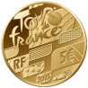 Cette pièce est axée sur le parcours officiel du Tour de France. Elle représente un cycliste devant le parcours officiel qui sera emprunté par tous les participants en juillet 2025. Divisée en deux par une ligne représentant une étape, la moitié du cycliste est représentée en dessin. Le contour de la pièce et les rayons rappellent une roue de bicyclette. Sur ce revers commun, les quatre maillots du Tour sont représentés de manière héraldique dans des marqueurs : le maillot jaune du leader du classement général individuel, le maillot vert du leader du classement par points, le maillot rouge à pois du leader du classement du meilleur grimpeur et le maillot blanc du leader du classement des jeunes. Dans les marqueurs sont également représentés le RF, la valeur faciale et la date de l'année. Le logo du Tour de France apparaît en haut et les poinçons en bas.