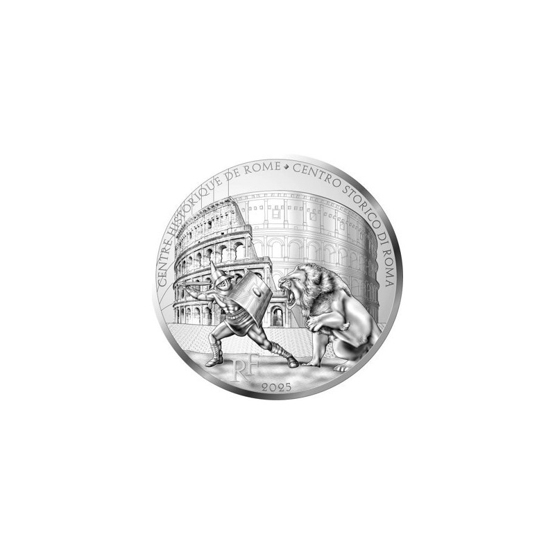 In the foreground, a Roman gladiator, equipped with a shield and sword, confronts a lion. This scene is reminiscent of the "shows" that took place in the Colosseum, where gladiators fought wild beasts to entertain the public. In the background, a detailed view of the left-hand side of the Colosseum and a schematic view of the right-hand side to illustrate its construction / reconstruction. The reverse is common to all the coins in the UNESCO series for 2020. It depicts the globe with parallels and meridians on the left-hand side and inscriptions of major UNESCO World Heritage sites on the right-hand side. The inscriptions are engraved in stone, echoing the Rosetta Stone. The left-hand side of the globe is surrounded by the UNESCO logo and the words "World Heritage". The face value is inscribed on the left-hand side of the globe, blending in perfectly with the parallels and meridians