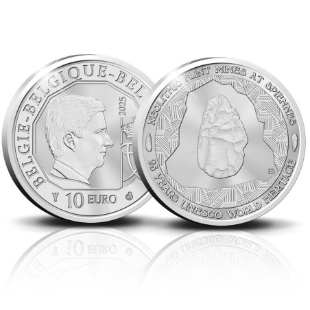 Zilveren eerbetoon aan de vroegste concentratie prehistorische mijnen! Anno 2000 werden de vuursteenmijnen van Spiennes opgenomen in de lijst van UNESCO-werelderfgoed. Deze neolithische mijnen werden in de 19e eeuw bij toeval ontdekt tijdens de aanleg van een spoorlijn. Ze zijn een van de oudste getuigen van menselijke industriële activiteit in Europa. Tussen 4200 en 2500 jaar voor onze jaartelling werden hier enorme hoeveelheden vuursteen gedolven, op een oppervlakte van meer dan 100 hectare. Op de voorkant van de zilveren munt van 10 euro 2025 staat een bijzonder realistische afbeelding van een handbijl van vuursteen in een rustieke omgeving (de ingang van de vuursteenmijn), waarrond een Engelse inscriptie in perfect passende typografie is aangebracht. Op de muntzijde staat koning Filip met zijn blik naar rechts, zijn monogram en het jaartal 2025 in een elfhoekig sjabloon. Op de buitenrand staan de drietalige landsnaam, het munthuis, het muntmeesterteken en de muntwaarde.