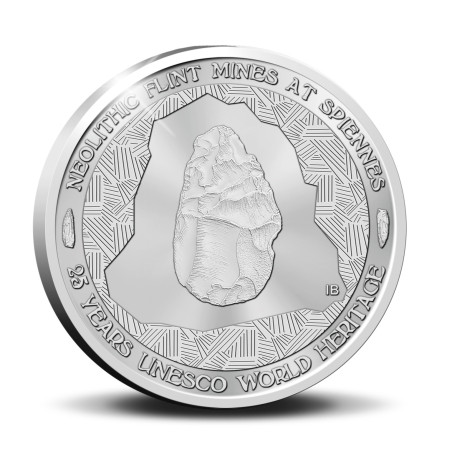 Zilveren eerbetoon aan de vroegste concentratie prehistorische mijnen! Anno 2000 werden de vuursteenmijnen van Spiennes opgenomen in de lijst van UNESCO-werelderfgoed. Deze neolithische mijnen werden in de 19e eeuw bij toeval ontdekt tijdens de aanleg van een spoorlijn. Ze zijn een van de oudste getuigen van menselijke industriële activiteit in Europa. Tussen 4200 en 2500 jaar voor onze jaartelling werden hier enorme hoeveelheden vuursteen gedolven, op een oppervlakte van meer dan 100 hectare. Op de voorkant van de zilveren munt van 10 euro 2025 staat een bijzonder realistische afbeelding van een handbijl van vuursteen in een rustieke omgeving (de ingang van de vuursteenmijn), waarrond een Engelse inscriptie in perfect passende typografie is aangebracht. Op de muntzijde staat koning Filip met zijn blik naar rechts, zijn monogram en het jaartal 2025 in een elfhoekig sjabloon. Op de buitenrand staan de drietalige landsnaam, het munthuis, het muntmeesterteken en de muntwaarde.