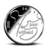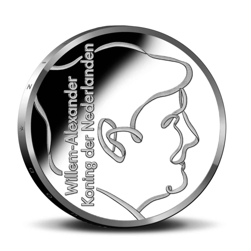 Op deze verzilverde 5 euromunt zien we het getal 75 afgebeeld door een lint. Op de keerzijde zien we het portret van Koning Willem-Alexander eveneens in de vorm van een lint. Dit 75 jaar vrijheidsvijfje is ontworpen door kunstenares Marijke van Warmerdam. Geïnspireerd door de feestelijke sfeer koos zij een lint voor het ontwerp.