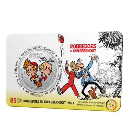 In nauwe samenwerking met de uitgeverij creëerde de Koninklijke Munt van België een energieke herdenkingsmunt van 5 euro. Echt een feest voor het jubilerende reporterduo! De uitgave van Robbedoes en Kwabbernoot is een collector's item voor numismaten en stripliefhebbers. De Belgische 5-euromunt '85 jaar Robbedoes en Kwabbernoot', met de portretten van de jubilerende reporters, vergezeld van hun eekhoorn Spip, is verkrijgbaar in twee versies: in reliëf en in kleur. Beide zijn geslagen in BU-kwaliteit en hebben een beperkte oplage van 7.500 exemplaren.