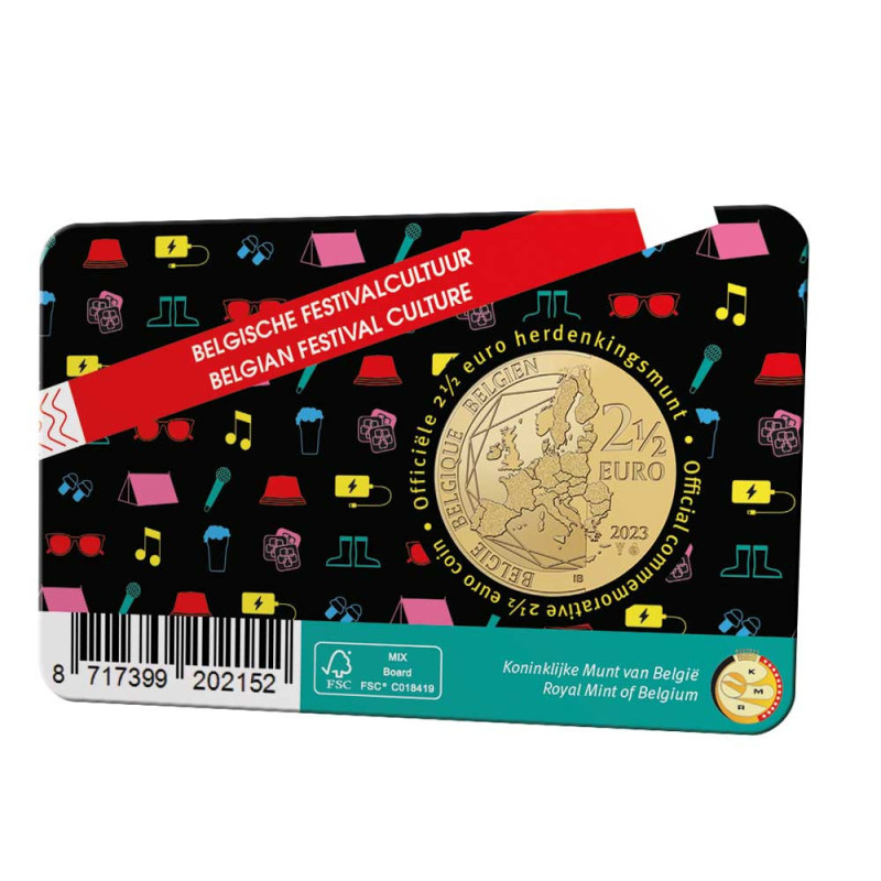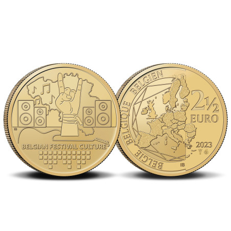 België, met meer dan 11,6 miljoen inwoners op 30.688 km2, mag dan een klein land zijn, we hebben wel de meeste festivals per hoofd van de bevolking ter wereld! België weet als geen ander hoe je een goed festival organiseert. Tomorrowland, Pukkelpop, Rock Werchter: het zijn maar enkele van de bekende Belgische festivals. Naast deze grote namen vinden er ook honderden kleinere festivals plaats. Kortom: keuze genoeg voor de festivalliefhebber! En de tickets voor het komende festivalseizoen zijn nu al erg in trek. Reden genoeg voor de Koninklijke Munt van België om een munt van 2½ euro uit te geven met als thema 'Belgische festivalcultuur'. De 2½ euro is geslagen in BU-kwaliteit en verschijnt in een coincard met twee taalversies. Op de muntkaart staan verschillende festivalarmbandjes afgebeeld, die vaak als toegangskaart voor festivals worden gebruikt en door velen worden verzameld. Op de munt gaat een hand omhoog die het 'rock on'-gebaar maakt, omgeven door concertprekers, muzieknoten, een gitaar, een equalizer onderaan en de kaart van België op de achtergrond.