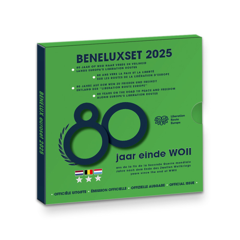 Naar aanleiding van 80 jaar bevrijding verschijnt in 2025 een bijzondere editie van de officiële Benelux Set. Deze jaarlijkse muntverzameling bundelt alle euromunten van België, Nederland en Luxemburg van het jaar 2025 in onberispelijke BU-kwaliteit. Dit jaar staat de set in het teken van de Liberation Route Europe – een indrukwekkend internationaal herdenkingsproject dat de opmars van de geallieerden en de bevrijding van Europa tastbaar maakt.