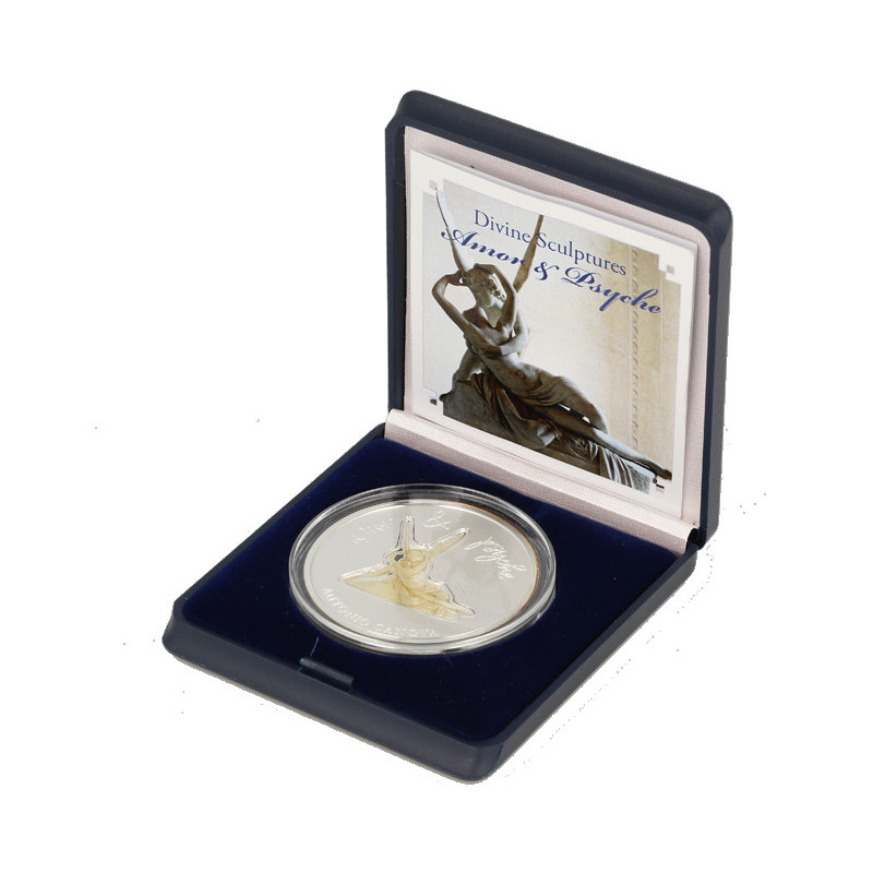 Deze unieke set bestaat uit twee Sterling zilveren herdenkingsmunten met een afbeelding van een neoklassiek meesterwerk van de Italiaanse kunstenaar Antonio Canova: "Psyche Revived by Cupid's Kiss". Canova's Amor en Psyche toont het liefdesverhaal tussen Cupido (Amor) en Psyche uit de oude mythologie. Het beeld legt een moment van intimiteit en tederheid vast wanneer Cupido de slapende Psyche zachtjes wekt met een kus. Canova's nauwgezette aandacht voor details en uitmuntend vakmanschap verlenen het beeld een gevoel van etherische schoonheid en emotionele diepte. Het is een meesterwerk uit zijn tijd en doet een beroep op de zintuigen van het zicht en de tastzin, maar zinspeelt tegelijkertijd op de romantische belangstelling voor emotie naast het neoclassicisme.