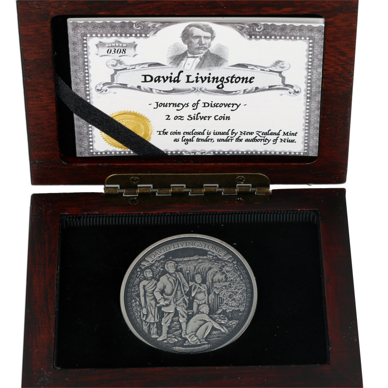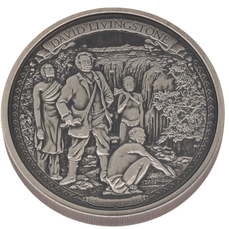 David Livingstone was een missionaris en een legendarische ontdekkingsreiziger van het Afrikaanse continent, een van de populairste nationale helden van Groot-Brittannië aan het eind van de 19e eeuw. Deze reliëfgegraveerde, antiek afgewerkte munt, toont een artistieke interpretatie van David Livingstone staand samen met zijn verkenningstroepen voor de adembenemend mooie Victoria watervallen.