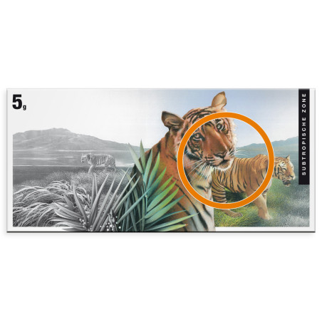 Op deze puur zilveren Flat Bar uitgifte in de muntkwaliteit ‘Uncirculated’ staat de Bengaalse tijger centraal. De Bengaalse tijger of koningstijger is een ondersoort van de tijger die voorkomt op het Indisch subcontinent. De vacht van de Bengaalse tijger is oranjebruin tot oranjegeel met verticale bruine tot zwarte strepen. Dit strepenpatroon verschilt in aantal, dikte en vertakkingen per individu. De Bengaalse tijger jaagt voornamelijk 's nachts en in de schemering. Hij jaagt onder andere op diverse soorten herten, varkens, antilopes, apen, runderen en zelfs jonge olifanten.