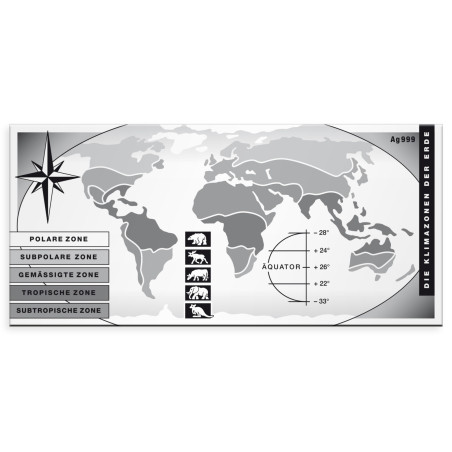 Rechts bovenaan staat het zilvergehalte "Ag 999" en verticaal de tekst "DIE KLIMAZONEN DER ERDE" (de klimaatzones op aarde).