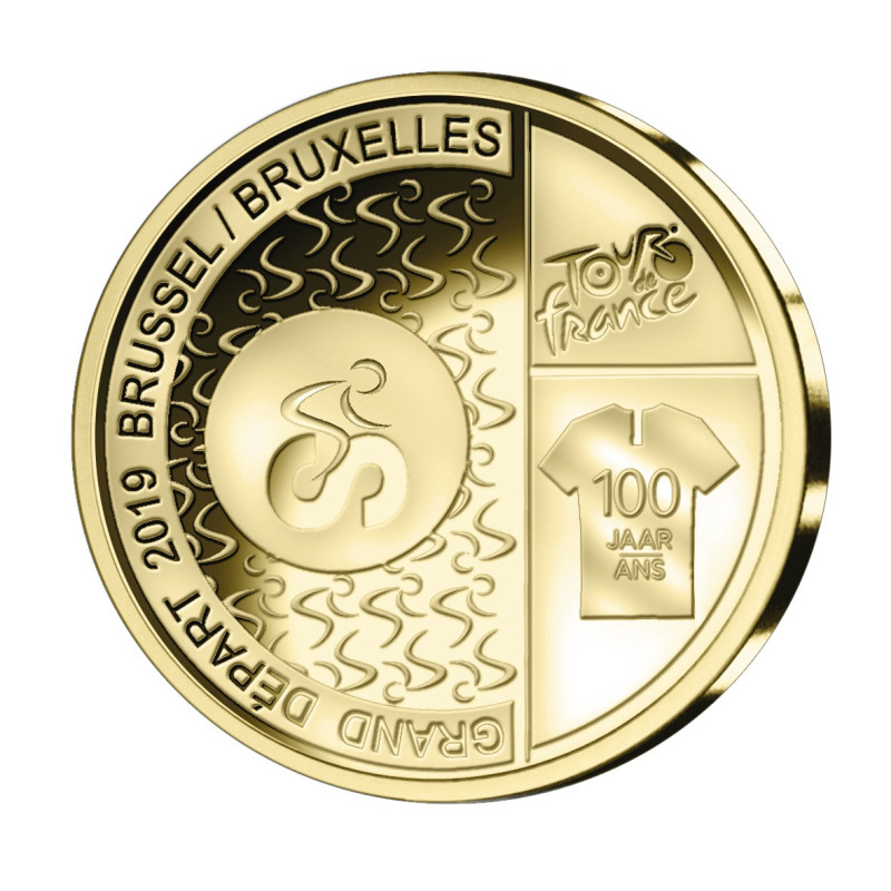 Op de munt staan verdeeld over drie vlakken het logo van de Tour de France, een 'gele trui' met de tekst "100 JAAR / ANS" en een gestileerde wielrenner met de tekst "GRAND DÉPART 2019 BRUSSEL / BRUXELLS".