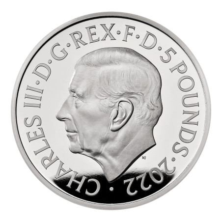 Deze speciale 5 Pond Zilveren Proof Piedfort-munt is uitgegeven als eerbetoon aan de in 2022 overleden Koningin Elizabeth II. De munt is twee keer zo dik als de gewone 5 Pound munten, weegt 56,56 gram en is geslagen in eersteklas Sterling (.925) zilver.