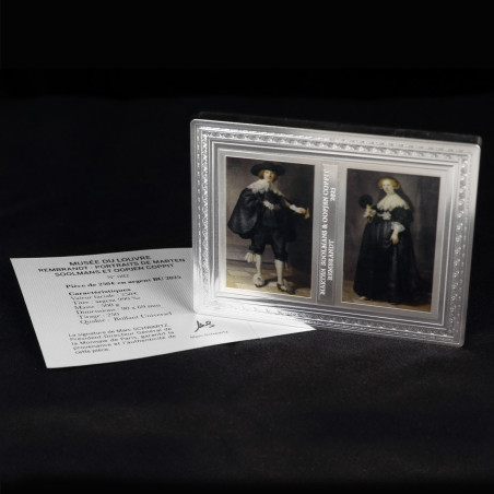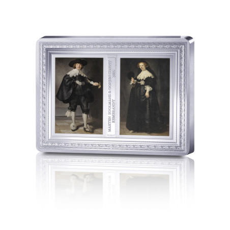 Deze twee levensgrote portretten, geschilderd in 1634, behoren tot de grote kunstwerken van Rembrandt, een van de meesters van de Nederlandse schilderkunst. Op de voorkant van deze 250€ zilveren 1/2kg Proof-munt zijn de portretten van Marten Soolmans en Oopjen Coppit ingekleurd en volledig afgebeeld. Ze zijn heel lichtjes vergroot in vergelijking met hun originele versie om de details zo goed mogelijk weer te geven. De namen van de geportretteerden, de schilder en het jaartal scheiden de twee schilderijen. De omtrek van de munt is versierd met de originele omlijsting van de portretten.