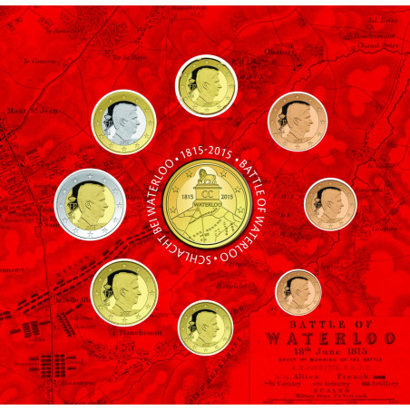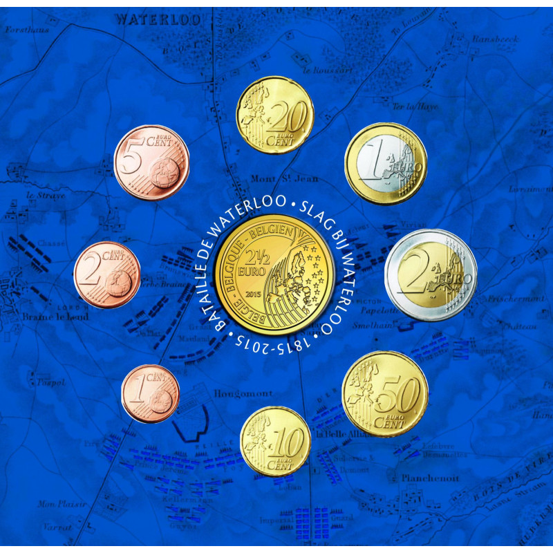 Deze 2015 B.U. set uit België heeft als thema de Slag bij Waterloo. De set bevat de 8 verschillende euromunten met Koning Filip, maar ook de speciale 2,5-euromunt '200 jaar Slag bij Waterloo'. De set wordt geleverd in een prachtige geïllustreerde verpakking.