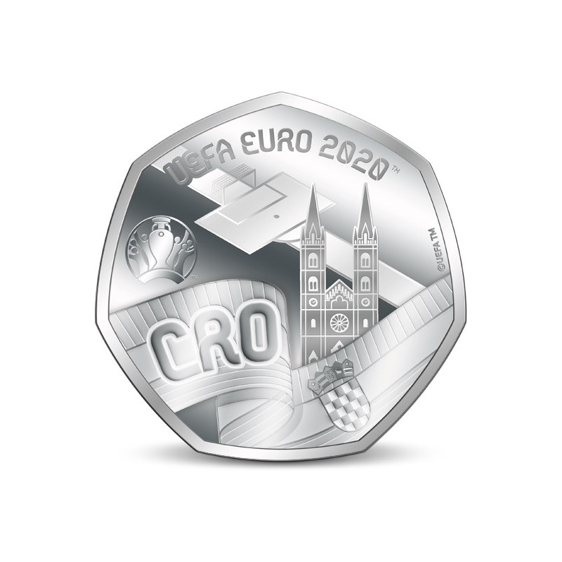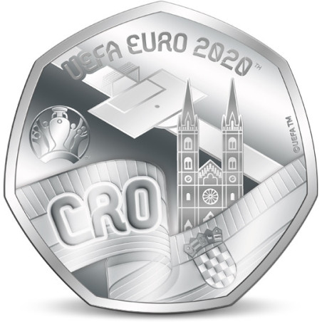 Op deze munt staat een wapperende vlag van Kroatië en de afkorting CRO. Verder zien we de Kathedraal van Zagreb en het EK 2020 logo.