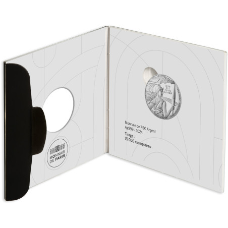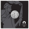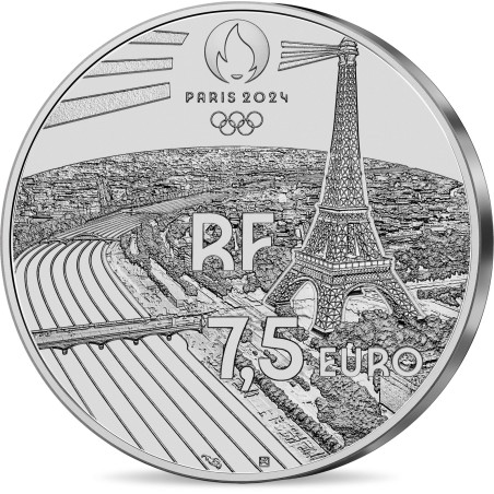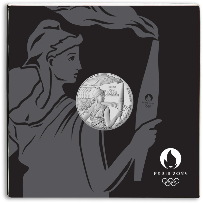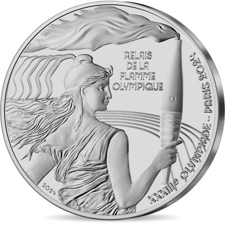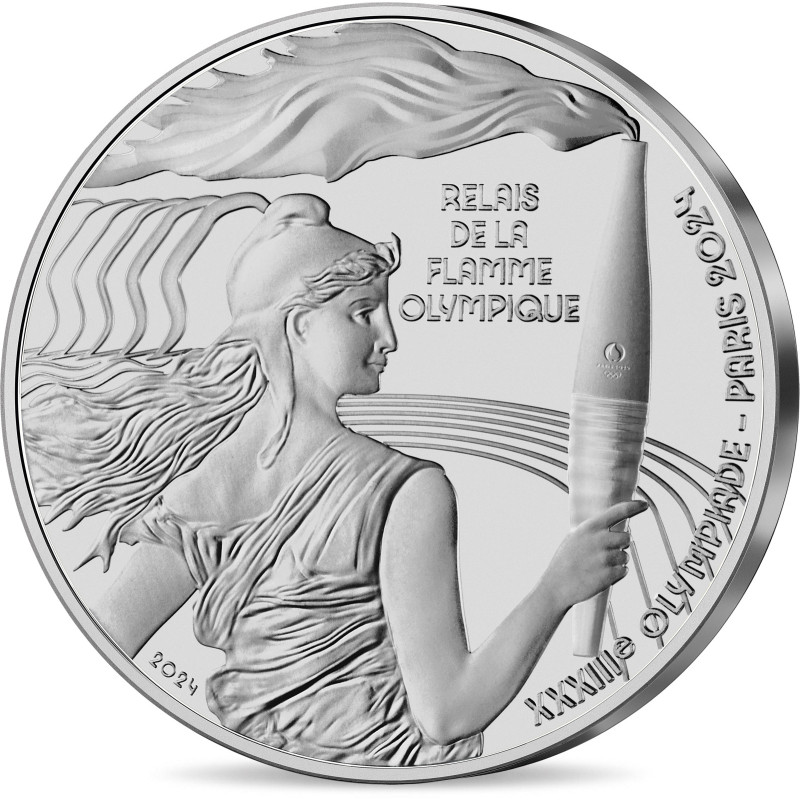 Op de voorzijde van de munt is Marianne, het symbool van de Franse Republiek, afgebeeld alsof ze in beweging is en de Olympische fakkel van de Olympische Spelen van Parijs 2024 vasthoudt. De vlam die bovenaan de fakkel danst, symboliseert de gepassioneerde geest en vastberadenheid van de atleten. Op de achtergrond strekt zich een atletiekbaan uit, een herinnering aan sport. De achterkant, die sinds 2021 gebruikelijk is in de serie, toont een uitzicht op Parijs waar de Seine eruitziet als een atletiekbaan. De Eiffeltoren domineert de stad en verlicht de wedstrijd.