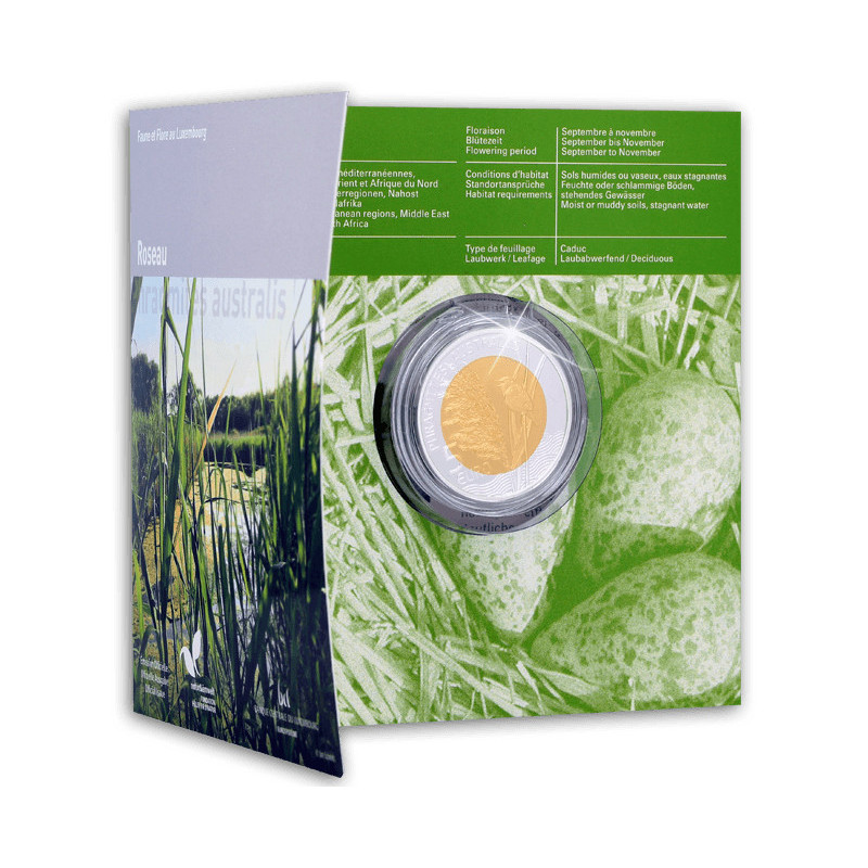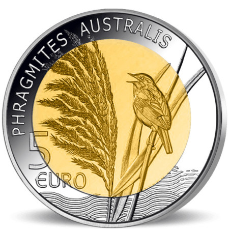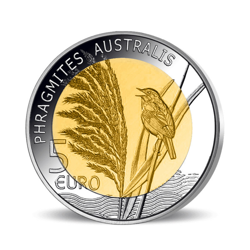 Deze prachtige Luxemburgse 5 Euro Herdenkingsmunt van Sterling zilver en Nordic Gold is een uit de serie munten met het thema Flora & Fauna van Luxemburg. Op deze munt staat het welbekende riet centraal, uitgebeeld met onder andere een rietplant en een vogel. Dit dier lijkt erg op een mus, maar het is een Rietzanger.