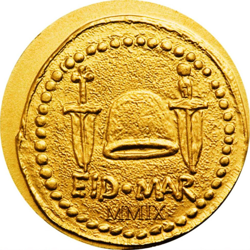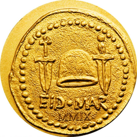 Deze kleine gouden munt is geïnspireerd op de beroemde Denarius van Brutus, geslagen ter nagedachtenis aan de moord op Caesar, met twee dolken en een vrijheidshelm. Op de voorkant zien we het wapenschild van Palau en de nominale waarde "1 $" (USD).